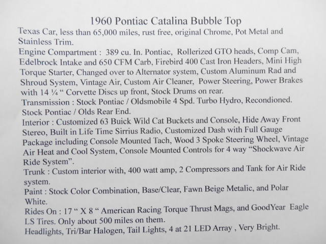 In Dec 2001 I received an e-mail post on a Pontiac forum about a 1960 Pontiac Catalina Tudor Sport Coupe that was for sale. I contacted the seller who sent me these photos, the car had original paint, interior and power train, and was originally from Texas - I was intrigued. As it turned out the car was already in Ontario and only 3 hours away, I made arrangements with it's owner, Todd St Clair, to see it the next day. The car exceeded my expectations for originality, plus Todd had acquired some rare original and aftermarket parts that were included. Two sets of correct Pontiac hubcaps, a full set of service manuals, a tri-power intake manifold and a set of new period correct Hedman 4 into 2 into 1 headers with dump tubes for the 389 motor. The deal was done and Todd agreed to store the car for me until spring has snow had already arrived. In April I picked the car up and on the way home stopped at the annual spring Collector Car Auction in Toronto and had 3 different people approach me in the parking lot expressing an interest in the car Once home I delved into the history of the car, Todd has lots of documentation including the original title to the car. Conceived in Kansas, delivered in Louisiana and residing in Texas from the age of one, life's journey has taken this car just over 58,000 miles to date. Todd had spoken with the original owner of the car, he was an employee of GM and also had a company car so this one had low miles, mostly driven by his wife. It has original paint and interior, and the original high compression 389 V8 and Super Hydramatic 4 speed automatic. This was the base power train for American Pontiacs, the ones sold in Canada were built on a Chevy chassis and came with 6 cylinder motors and 2 speed Powerglide transmissions. The American Pontiacs were also bigger cars with a 3" longer wheelbase and 5" wider track. It had some cool time period stickers on both rear windows too. I soon had plans to make a nostalgic drag racer out of it, but decided it was really too mint for that. Bob McLean from British Columbia was looking for a nice 60 Catalina similar to the one he owned in 1960, he really liked this one so it now resides on the west coast of Canada. The last time I saw the car and Bob was at the rail terminal in Toronto where it was being loaded on a train for Vancouver I had the headers ceramic coated and sold them to Kenneth Davis at the Pontiac Nationals for his Hot Chief #1 nostalgic drag car In 2007 the Catalina reappeared - Bob had sold the car to a new owner who modified with air ride suspension, 20" Torque Thrust II wheels, disk brakes, new paint and custom interior. The engine compartment confirmed it was definitely the same car but it now sported dual carbs on the 389 motor. Fast forward to 2025 and this car has a new owner. Since the first conversion to a "restomod' it has been refined by the next owner, Rick Ashton, here are the details. There's now an alternator for the electrical system, a new heating/air conditioning system, a killer hidden audio system and much more. The engine has been upgraded by Dave Bisschop of SD Performance with some great Pontiac performance parts, and the Super Hydramatic transmission rebuilt. The air ride suspension now rides on 17" rims instead of 20's. Another ownership change and Shaun Rickerby is now the keeper of this beauty, and here is a an updated summary of this cars features and photos. |